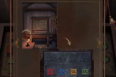 20、点击场景左侧木箱子,根据房屋图案以及按钮颜色判断,输入密码七二五九打开木箱,获得军旗。