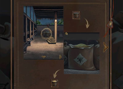 24、点击旁边的茅草垛,进入移动茅草的小游戏,完成后可将茅草垛移动到柱子下方,之后从灯上面获得锋利的匕首。