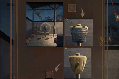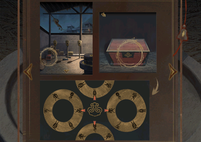 28、使用谷粉喂食马匹,马低下头的时候查看墙壁上的线索,点击场景左边墙根得木箱,如图所示根据马匹背后墙上图案调整转盘,打开木箱。