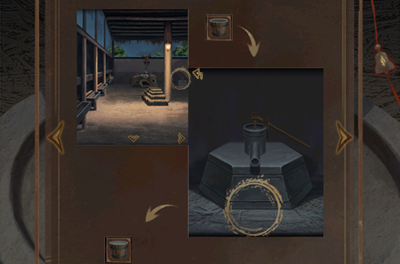14、点击场景中的铜漏,将一桶水倒入铜漏并安装好木刻尺,通过点击上方进水口和下方出水口调节刻度尺到卯时刻度。