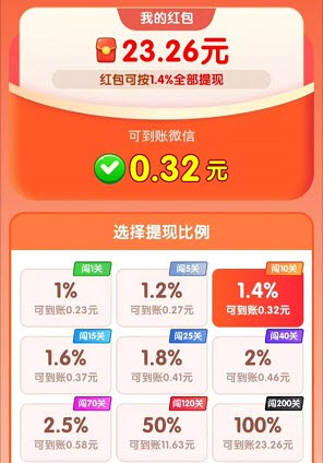 3、成功过关即可领到红包奖励,闯过的关卡越多,兑换的比例也就越高,你的收益就会更大。