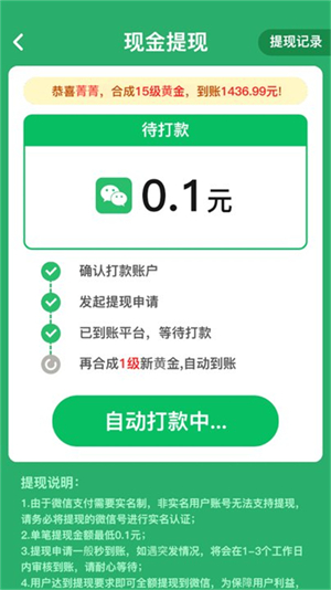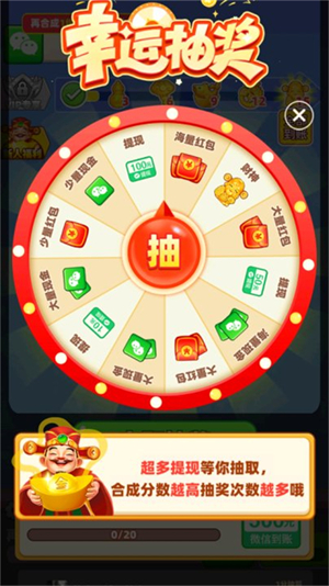 1、是可以提现的,游戏里有两种获得红包的方式,一种是合成,另外一种是转盘抽奖,游戏没有设置提现比例,获得多少就会提现到账多少,虽然没有提现比例限制,但是需要完成任务获得提现机会。