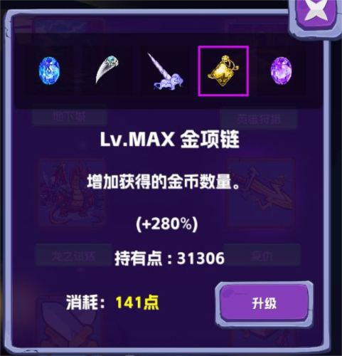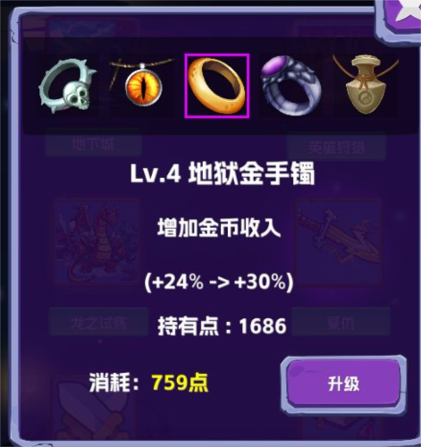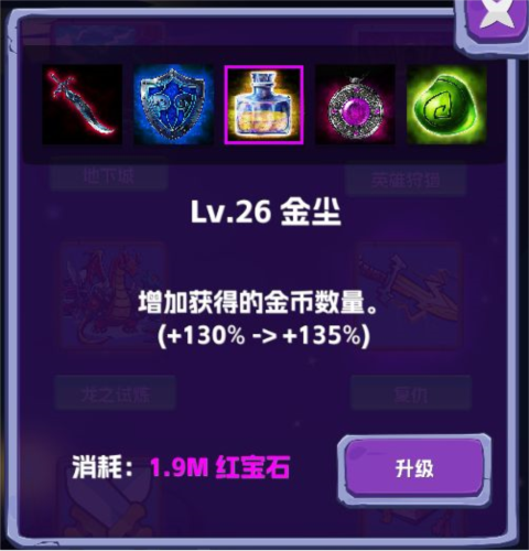升级对应的道具或其他的属性来增加自己的财富获取量。如: