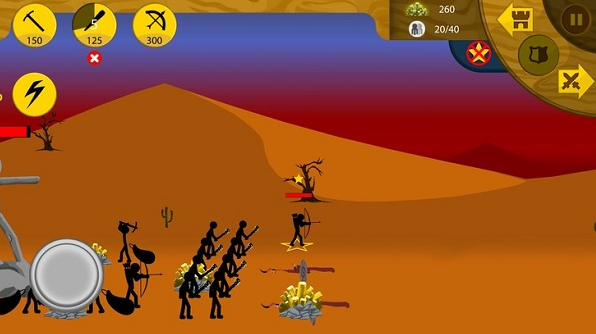 款游戏最吸引人的地方就是他比较自由,在玩的时候我们是可以操作一个士兵的。而且游戏的画质很不错(毕竟是火柴人游戏),双方的较量还是比较公平的,我们都是需要一点一点的挖掘金矿来崛起,能不能通关就在于我们的合理分配资源和士兵的运用上了。