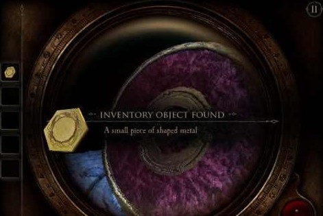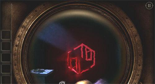 8、把我们刚弄到的完整的眼镜带上,对着这个圆盒子盖看上去,我们会发现有一个红色的指纹,这是我们点击指纹处。把手按倒红色指纹上去,这时我们会发现中间的小圆块会打开,我们会得到一个六边形铜片。