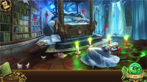 12、回到皇后的房间,点击书架,将太阳石放入凹槽中,进入一个机关。按要求操作就能打开暗门。