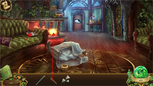 13、打开暗门后发现里面漆黑一片,需要火把才能进去,然后我们来到客厅,将熄灭的火炬到壁炉的火中点燃,再移开沙发上的枕头,有本书,点开可以获得一块碎片。