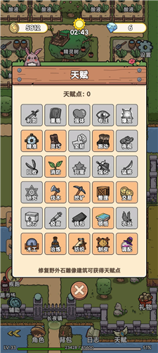 天赋加点:通过修复野外石像获取点数,修复完以后是不会显示石像名的,具体修复材料可通过日志点击查看。优先加点最后一排和第四排,可节约木材基础资源,减少金币消耗等。个人加点如图。