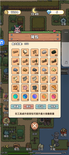 背包,通过工具桌进行升级。点开背包左上角有最大数量显示。举例,如果你通过广告已经刷满背包上限木头,后面只会有金币和经验,而不会再有木头。