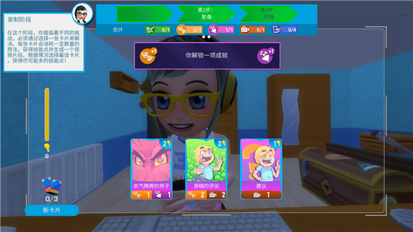 12、在录制阶段,你面临着不同的挑战,必须通过选择一张卡片来解决。每张卡片会消耗一-定数量的想法,获得技能点并生成一一个视频片段。根据情况选择最佳卡片,获得尽可能多的技能点;