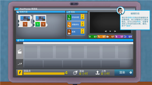 13、在编辑阶段,通过将视频片段拖动到编辑轨来创建视频,努力调整使它们更加融合。还可以添加特效,但要考虑好工作站的渲染点数。最后,按下"渲染”即可,除此之外,游戏中还有很多玩法等着玩家自行下载体验!