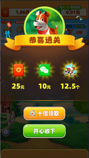 4、过关就能拿到红包奖励和小狗碎片。