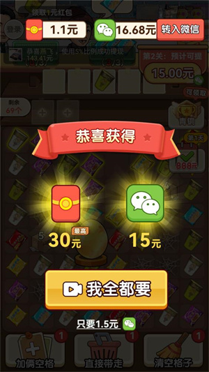 2、通过不断的进行闯关来得到红包奖励,自由兑换各种的道具。