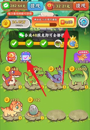 1、新人登录就送20红包,后续一共有2个奖励方式,一个是左上角的打卡奖励,另一个则是合成次数奖励。