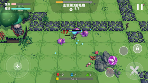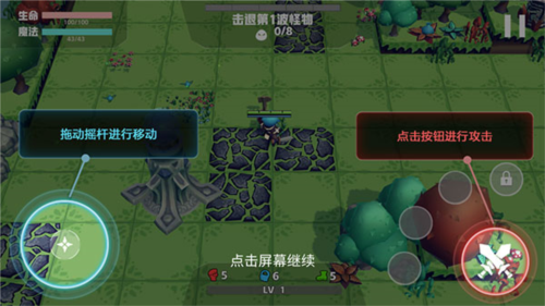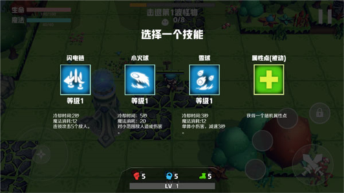 3、上方的黄色条是敌人的波次,左上角是自己的生命和魔法值,击败眼前的敌人,获取升级。