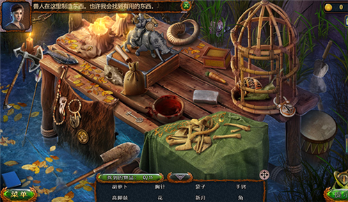 4、点击桌子,在这里进行寻找游戏,本次进行通关时寻找的东西为胡萝卜、胸针、袋子、手铐、高脚鼓、花、新月、角,每寻找到一个物品就会新增一个物品,如视频所寻找,总共要寻找15个物品。
