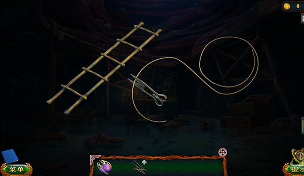 6、在箱子当中获得球面石,还有剪刀。接着进行拼装打开刚刚的梯子,将上面散落的木材装上梯子,最后再将绳子打开,使用剪刀剪开。