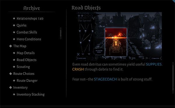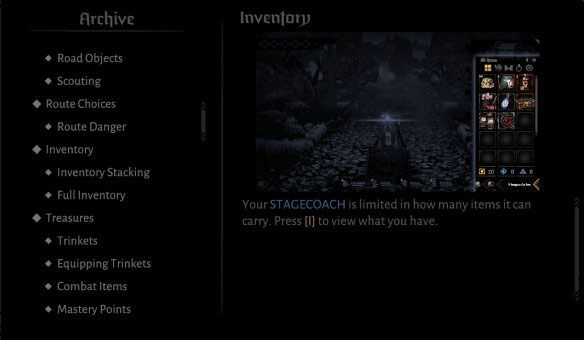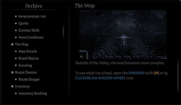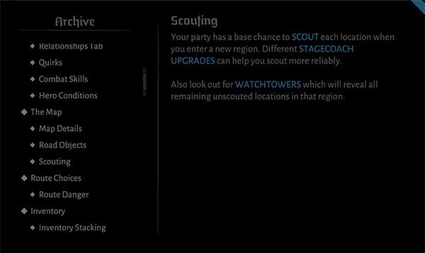 当你进入一个区域时你的队伍对每一个地点有一个基础侦察概率,不同的马车升级会带来对某些或者全部遭遇的侦察概率,可以帮助你进行侦察。当然你也可以在地图上寻找watchtowers(瞭望塔),它会揭示所有该地区还没有被侦察出来的地