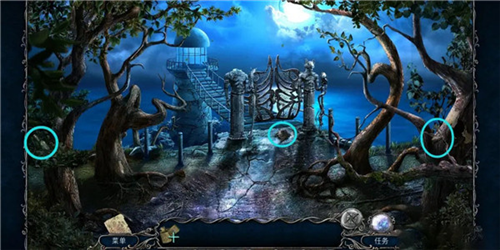 3、进入花园点击左上角的建筑花纹达成3/22成就【侦探】,接着拿走喷泉池里的「铲子」,然后再拿走右边藤蔓上的「干苔藓」。