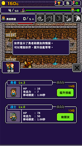 3、点击【伙伴】选项,你可以查看当前的伙伴信息,还能提升他们的技能。