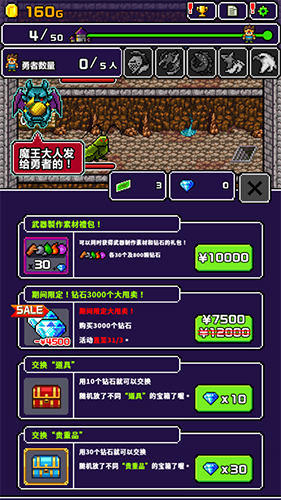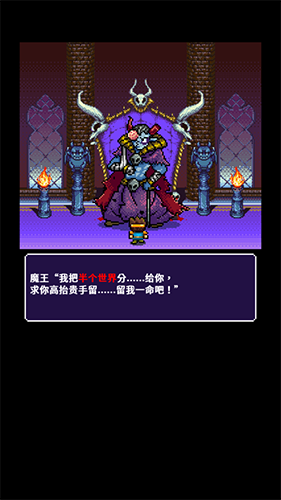 勇者明明说好分我半个世界破解版是一款像素风格的冒险闯关类游戏。该版本为破解版,你进入游戏之后就可以获得无限钻石,随意提升技能与购买道具。游戏以经典的勇者冒险挑战魔王的故事为故事背景,但是不同的是,魔王向勇者乞求饶他一命,并承诺分给勇者半个世界。但是没成想魔王出尔反尔,深感被骗的勇者只好又重新开始踏上冒险的旅途。