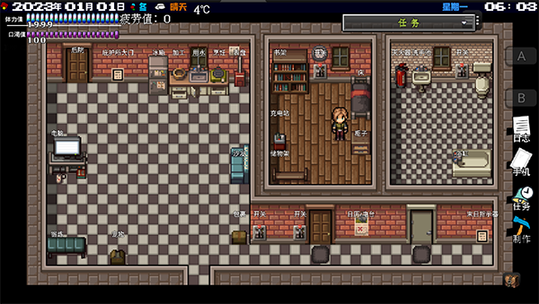 有三个比较重要的数值,分别是生命值、口渴值和健康值,这里面生命值和饱食度是挂钩的,吃饱了生命值就高 ,其次口渴值掉的快(当然可能跟我吃压缩饼干很大关系),全靠喝水补;健康值一开始疯狂掉,然后及时打抗生素就好,抗生素可在小诊所获取,排除掉我没看到这个任务,当我意识到每天早上为啥提示我健康值过低时,我的健康值就剩2了,(疯狂打工三四天才赚满1000币才挽救回我的性命)健康值过低就需要到小诊所去治疗花费500/1000币;题外补充一个洁净值,据说会影响健康,没亲测过,但每天可以通过洗漱回一小点,洗澡回多点来补充。
