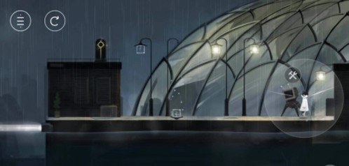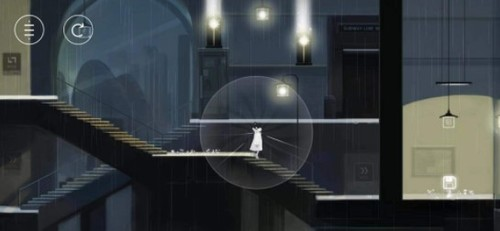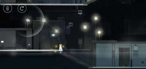 第一步:进入游戏画面,直接往右边走,用手指将前方的灯光拖到黑色灯柱处,然后去最右边吸收灯光,走到掉下来的灯柱处进入下一个场景。