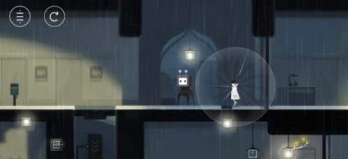 第四步:下来之后吸收一个灯光传递到最右边的灯柱上,接着再吸收一个灯光离开这里,来到下一个场景往右边走,将身上的灯光传递给机器人上方的灯芯。