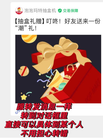 卖家从APP 「泡泡玛特」-「我的盒,柜」选择要转赠的娃, 以图片形式分享给买家,也就是下图这样的;买家扫描二维码, 接受转赠即可