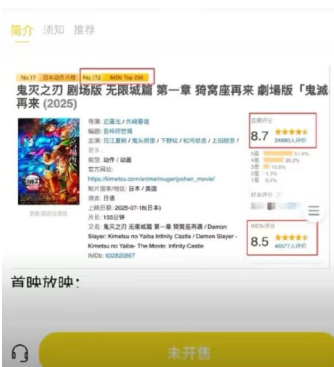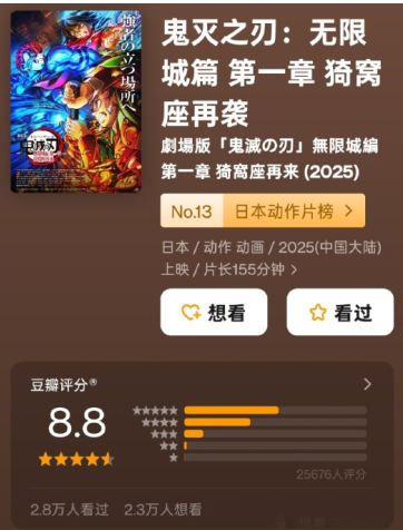 据了解,电影《鬼灭之刃:无限城篇》上映23天票房破200亿日元,刷新日本影史最快纪录;上映38天票房超280亿日元,跻身影史前三。全球票房更是狂揽8.2亿美元(约60亿人民币),成为首部冲进全球影史前100名的日本电影。