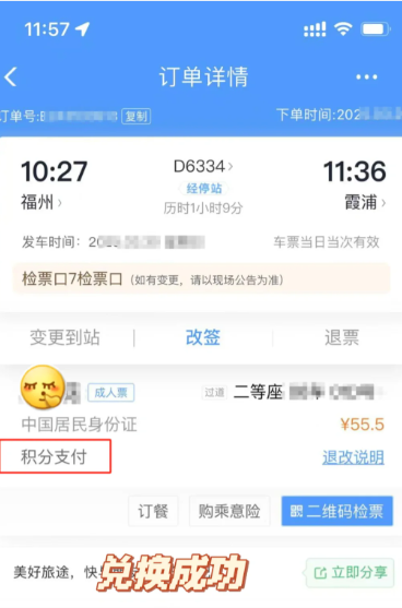 4.积分兑换的车票不能打印报销凭证和退票(改签不知道,可以自行查一下 好像要1千积分才能改)