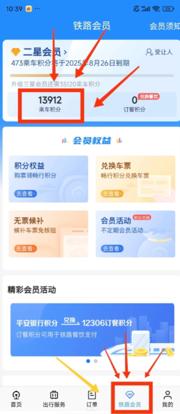 打开12306app,点击底部的【铁路会员】进入,之后就可以很直接的看到积分的详细了。