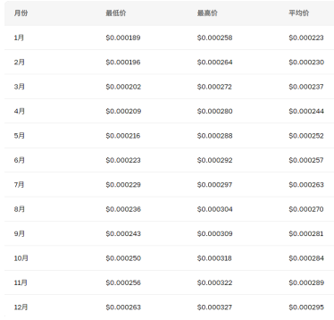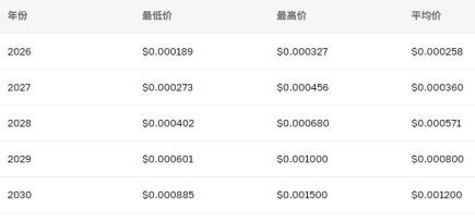 预计 Floki Coin 在2026年增速放缓,最高达到 $0.000327。放缓原因主要是与 RiceAI 和 SPACE ID 合作的热度下降,以及 Valhalla 和 Floki University 社区活跃度减少。这可能是由于其他迷因币生态系统的发展所致。