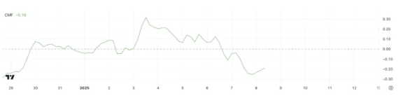 Ethena Chaikin 资金流量(CMF) 目前为-0.19,较昨天的低点-0.25 略有回升。 CMF 是一种技术指标,根据特定期间内的价格和交易量来衡量资金流入或流出资产的情况。