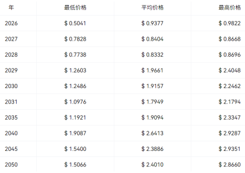 根据我们的价格预测,到2026 年,LUNA 价格将最高达到0.9822 美元,平均价格为$0.9377。而到2030 年,LUNA 价格将在最高2.2462 美元和最低1.2486 美元之间。最后,到2050 年,LUNA 价格将最高达到2.8660 美元。