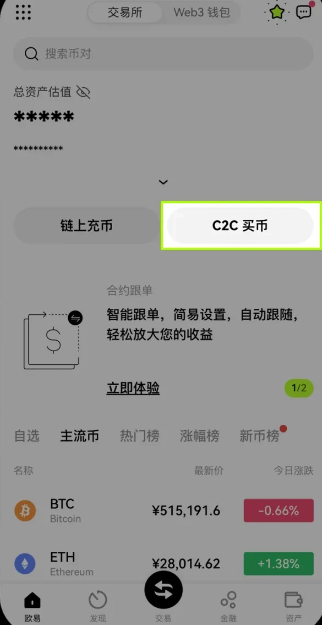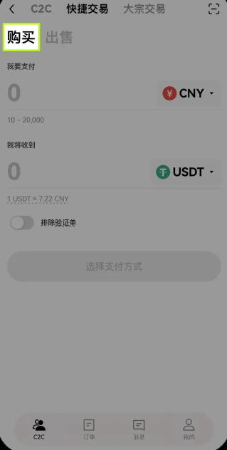 一、打开欧易首页-点击C2C买币-快捷买币-点击购买-选择需要购买的数字资产