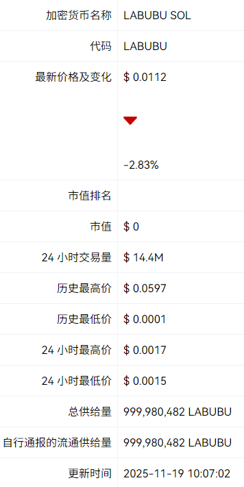 在2024 年11 月迷因币板块爆发期间,$LABUBU 价格曾触及$0.02064 的价格高点,其市值也一度突破2000 万美元。