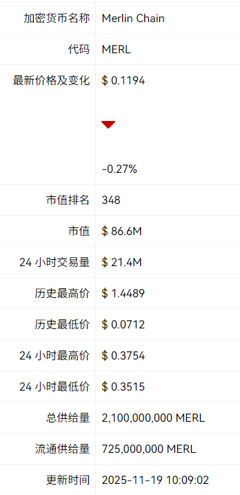 当前MERL 市值为$ 86.6M,在所有加密货币中排名第348。