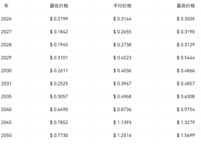 对2050 年的预测表明,DOGE 将出现显著增长。狗狗币交易价格将在0.7730 美元和1.5699 美元之间。