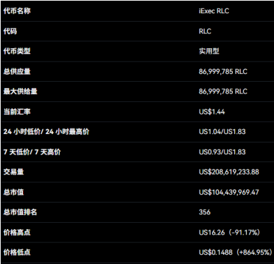 RLC是iExec 云平台发行的代币,其全称为iExec RLC,又叫云算宝、红叶币,发行于2017 年4 月19 日,可用于租用服务器、数据和应用程式。