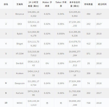 相较于现货交易所,加密货币衍生品交易所更需要市场的流动性,如果流动性不佳,将会很容易造成爆仓,加上部分交易所受限于国家政策因素,无法推出衍生品交易。因此建议的选择较少,这边只列举全球前 10 大衍生品加密货币.