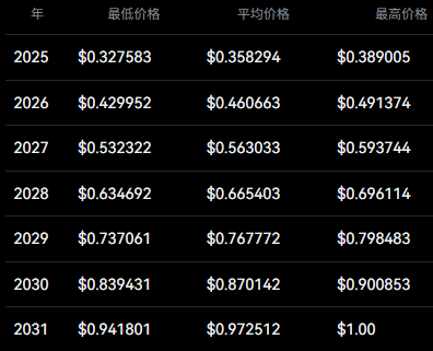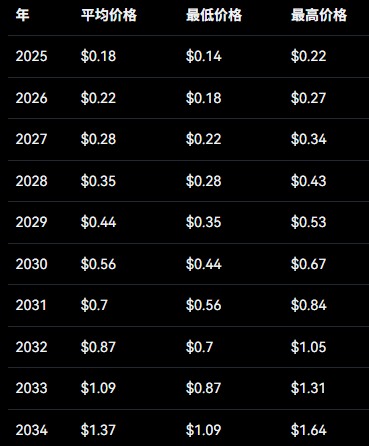 AmbCrypto 的长期价格预测则表明,在2031 年,OGN 的最高价格将为0.67 美元。以下是该网站站Origin Protocol 代币2025-2034 年的长期价格预测表: