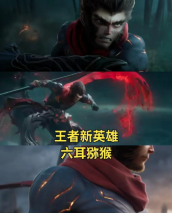 他的全称也叫作“六耳猕猴”,在西游记里跟孙悟空是“真假美猴王”的宿敌关系,形象也跟孙悟空非常相似。而在新英雄的CG里,也会出现六耳跟孙悟空争斗的场面。