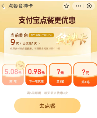 大家如果想要进入这个界面的话直接在支付宝上搜食神卡就可以进入了哈,可以看到自己每次优惠的金额;