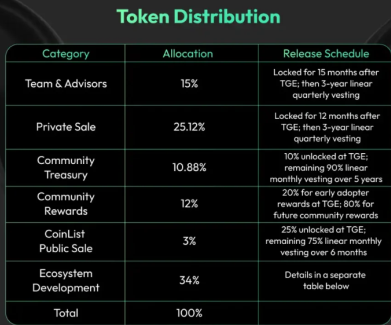 CoinList公开发售:3%,25%上线后解锁,剩下75%在6个月内线性按月解锁;