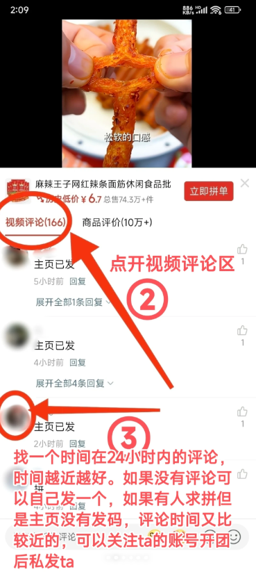 p1-3在主页右上角的【视频】评论区里找已开团的陌生拼友拼团