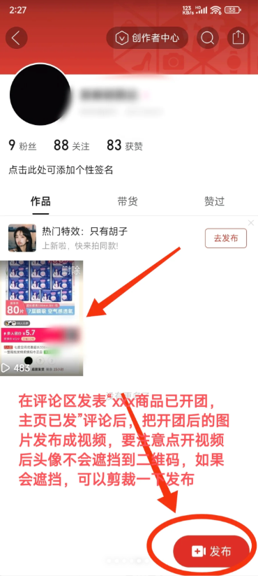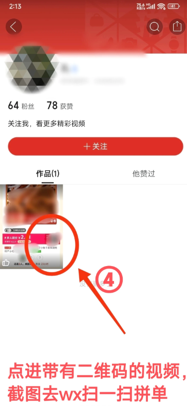 点进一个主页,看到发布拼团视频,将拼团码截屏。