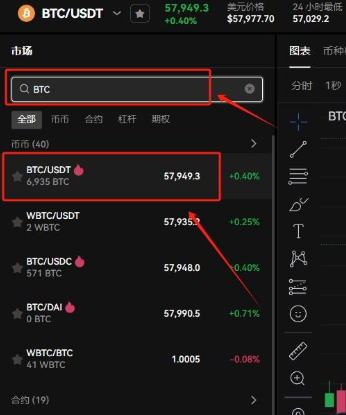 6、在搜索框输入BTC,选择BTC/USDT交易对,可以看到BTC实时行情;