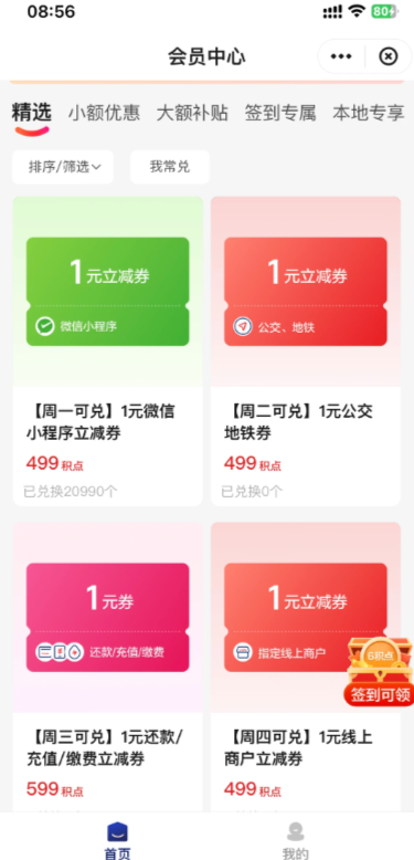 满10-1元指定商户立减券:299积点兑换,每周1张(如淘宝、微信小程序等)。