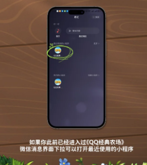 如果你此前已经进入过《QQ经典农场》,微信消息界面下拉可以打开最近使用的小程序。